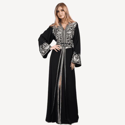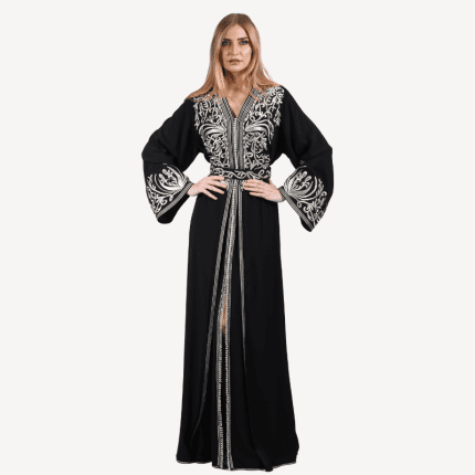 Takchita fluide Amina Mautassin – Noir Intemporel et Broderies Argentées