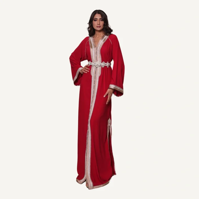 Discover the Caftan Ghazal , an iconic piece of Moroccan haute couture by Mautassin . This vibrant red caftan , enhanced by an artistically crafted khrat , embodies the perfect blend of tradition and modernity . Each hand-embroidered detail reflects the exceptional craftsmanship of our artisans. Ideal for weddings , celebrations and special occasions , this caftan brings a touch of refinement and character to your style. Wear the Caftan Ghazal to shine with distinction and honor Moroccan elegance .
