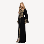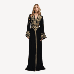 This deep black caftan, enhanced by sumptuous gold embroidery, embodies royal elegance in all its splendor. With its meticulously crafted baroque motif and majestic flared sleeves, it evokes an imperial silhouette with timeless oriental charm. Its fluid, fitted cut gracefully hugs the shape, lending allure and confidence to the wearer. Designed by Mautassin, this exceptional model is aimed at women seeking distinction, combining Moroccan tradition and contemporary splendor.