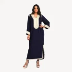 Available in refined shades of royal blue, midnight blue, and sky blue, it offers a sophisticated palette perfect for a variety of occasions such as ceremonies, elegant evenings, or formal events. The Abeer Gandoura is ideal for women seeking a versatile and sophisticated outfit where modernity harmoniously meets the richness of tradition. This piece flatters the silhouette and reflects the timeless charm of Moroccan craftsmanship.