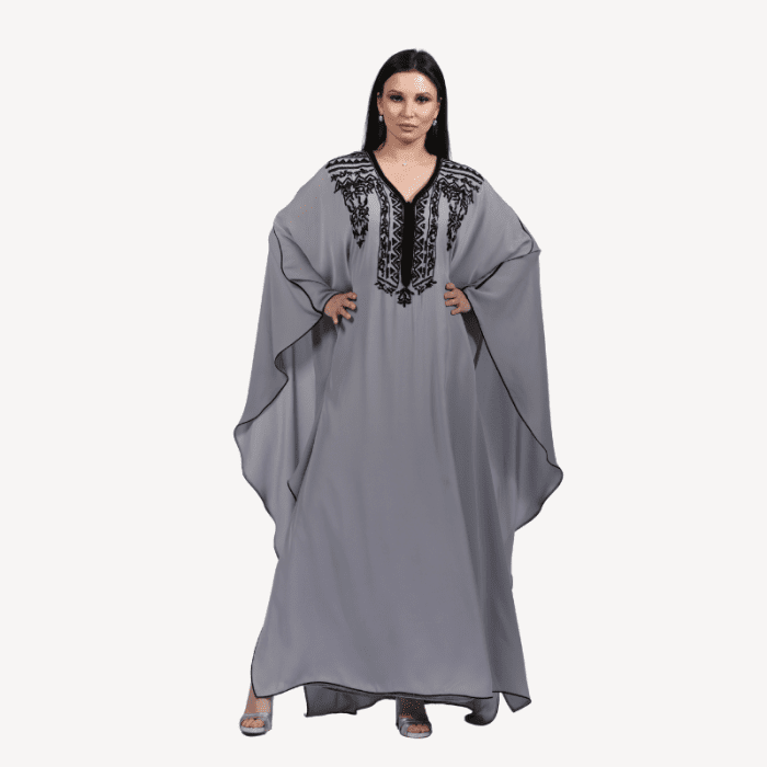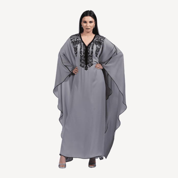 In a deep pearl grey enhanced with beaded black embroidery, the Inaya Gandoura embodies minimalist elegance with a dramatic twist. Chic and structured, it is perfect for both formal evenings and cultural events. Its flowing silhouette offers a look that is modern, mysterious, and effortlessly sophisticated.