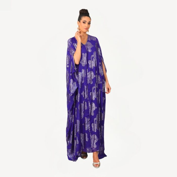 Discover the Salma Gandoura by Mautassin, a refined piece that perfectly combines elegance and comfort. Handcrafted from high-quality silk and tlija, this gandoura features a flattering cut that adapts to all body shapes, enhancing your style effortlessly. Its soft, sophisticated mauve blue hue makes it a versatile outfit, ideal for all seasons and every occasion.