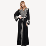 Classic and majestic, the Takchita Amina Mautassin is designed in deep black, enhanced with dazzling silver embroidery. Fluid and imposing, it embodies Moroccan nobility and elegance in its finest expression.