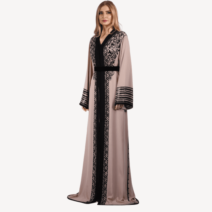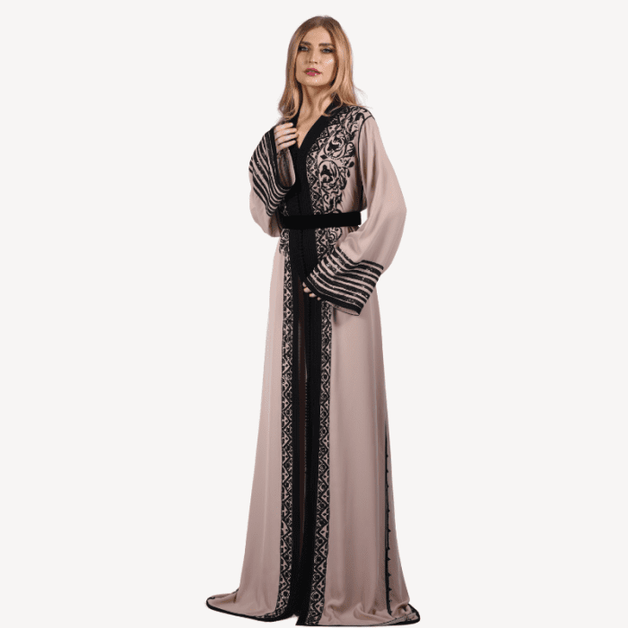 Mysterious and captivating, the Takchita Farah Mautassin plays on the contrast between a silky smoky gray and generous black embroidery. Its flowing fabric gracefully accompanies movement, for a comfortable and sophisticated fit.