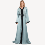 Soft and refined, the Takchita Yasmine Mautassin stands out with its almond blue color and light gold embroidery. Its flowing cut brings comfort and elegance, while its shiny finishes reveal a sure and refined taste.