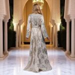 Let yourself be enchanted by the delicate radiance of the Takchita Nour , an exceptional piece in icy pearl shades , ideal for enhancing your most beautiful moments. This fluid and sophisticated creation, made from a lightweight, light gray, almost ivory fabric, is enhanced with sumptuous silver embroidered patterns , bringing shine and distinction to every movement.