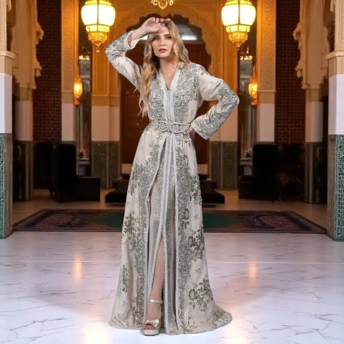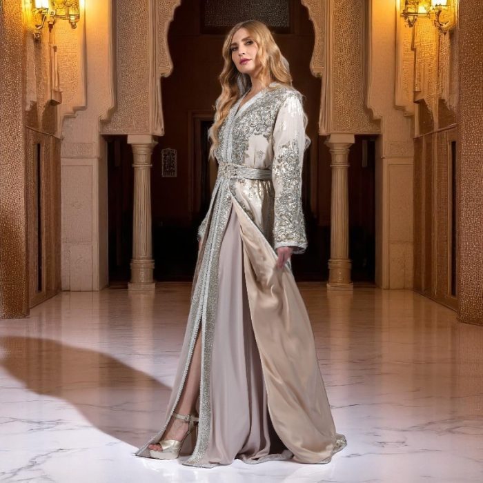 Let yourself be enchanted by the delicate radiance of the Takchita Nour , an exceptional piece in icy pearl shades , ideal for enhancing your most beautiful moments. This fluid and sophisticated creation, made from a lightweight, light gray, almost ivory fabric, is enhanced with sumptuous silver embroidered patterns , bringing shine and distinction to every movement.