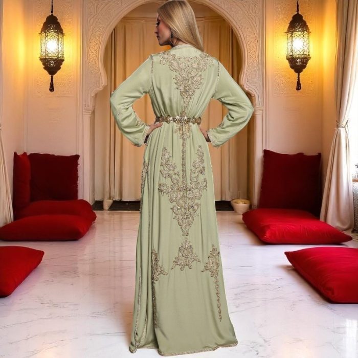 The Takchita Noura is an ode to grace and softness. Crafted in a delicate shade of pale almond green , this flowing creation is enhanced by gold thread embroidered motifs , which add a touch of light and sophistication to the ensemble.