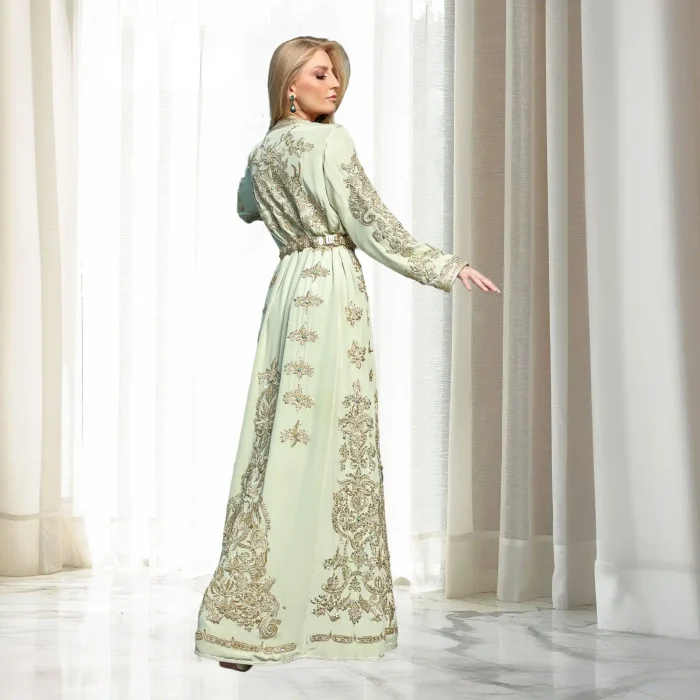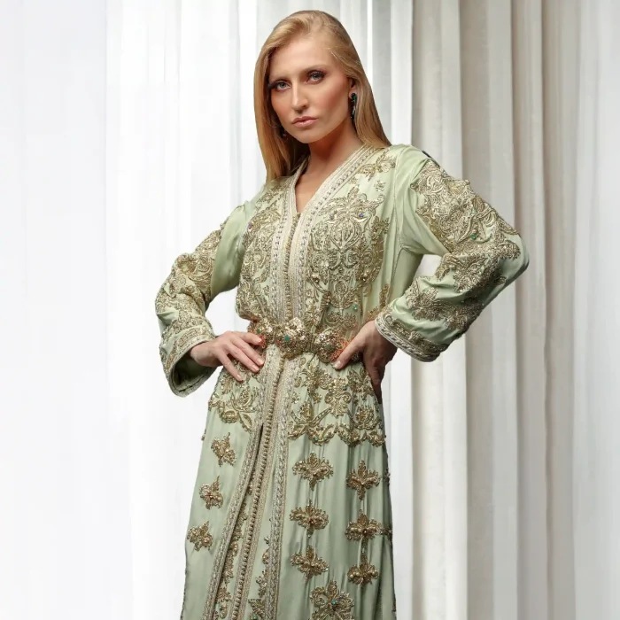 Optez pour la Takchita mariée verte eau brodée de Mautassin. Un caftan brodé somptueux, parfait pour les cérémonies nuptiales.