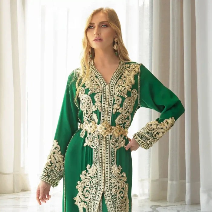 Takchita verte mautassin, parfaite pour une mariée cherchant à allier tradition et modernité.