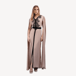 Sculptural et élégant, ce caftan robe associe le nude doux au noir profond dans un jeu de contrastes sophistiqués. Les broderies argentées, finement exécutées, apportent une touche précieuse à l’ensemble, soulignant avec justesse la noblesse de la coupe. Sa silhouette élancée et sa finition soignée en font une tenue de caractère, parfaite pour briller lors de cérémonies ou soirées élégantes. Une création audacieuse signée Mautassin, entre modernité assumée et héritage marocain.