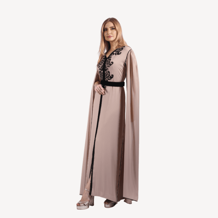Caftan robe nude et noir – Contraste Raffiné et Broderies Majestueuses