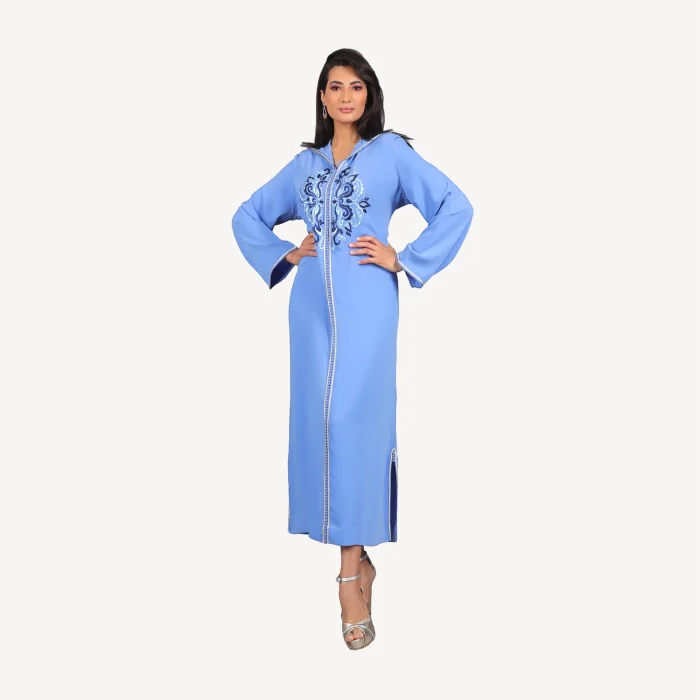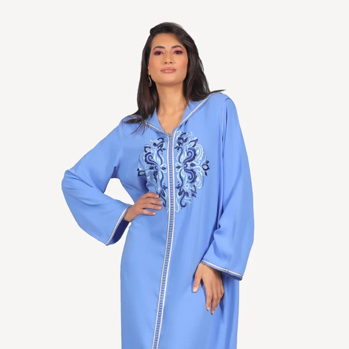 Les broderies fines, réalisées à la main, apportent une touche artistique et précieuse, faisant de cette djellaba artisanale un choix parfait pour des cérémonies, réceptions ou soirées élégantes. Déclinée dans des teintes éclatantes telles que le bleu apaisant et le corail vibrant, cette djellaba est idéale pour toute occasion spéciale.
