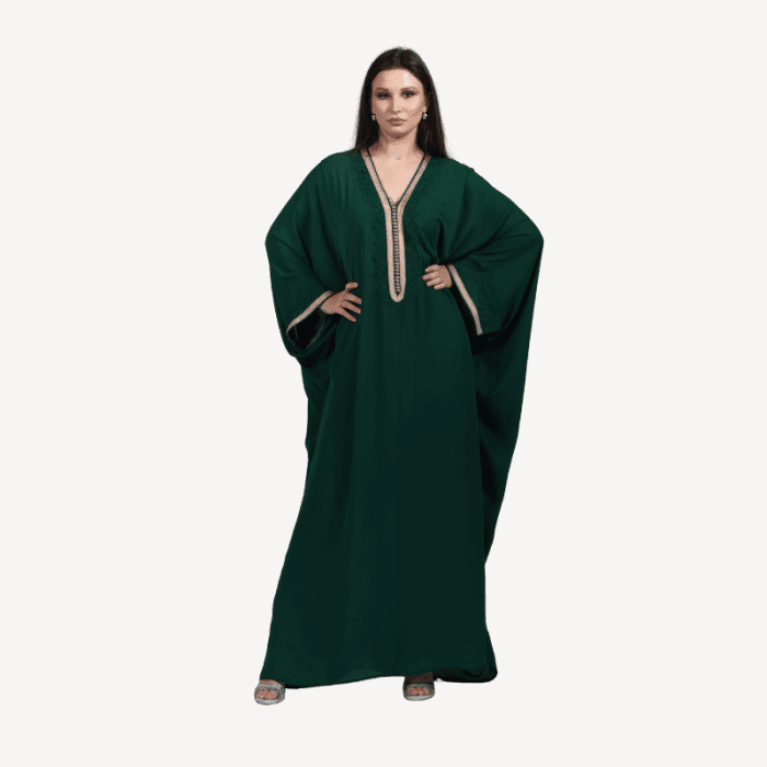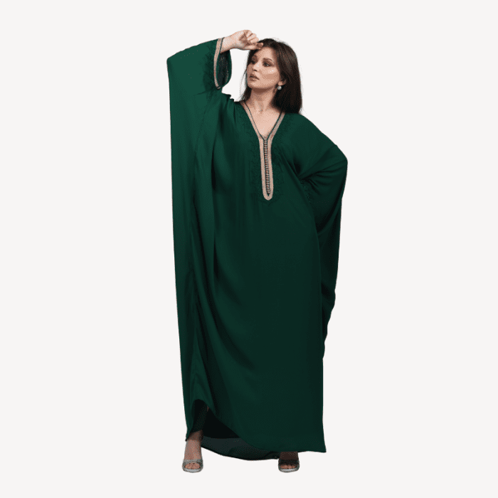 Plongez dans un univers de prestige avec la Gandoura Malak, teintée d’un vert émeraude profond et illuminée de broderies précieuses. Majestueuse et affirmée, elle évoque la noblesse orientale dans toute sa splendeur. Idéale pour les grandes célébrations, elle transforme chaque apparition en moment d’exception.