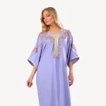Ornée de broderies artisanales et de perlage délicat, réalisés à la main par des artisans marocains, cette gandoura se distingue par son design sophistiqué et ses finitions minutieuses.