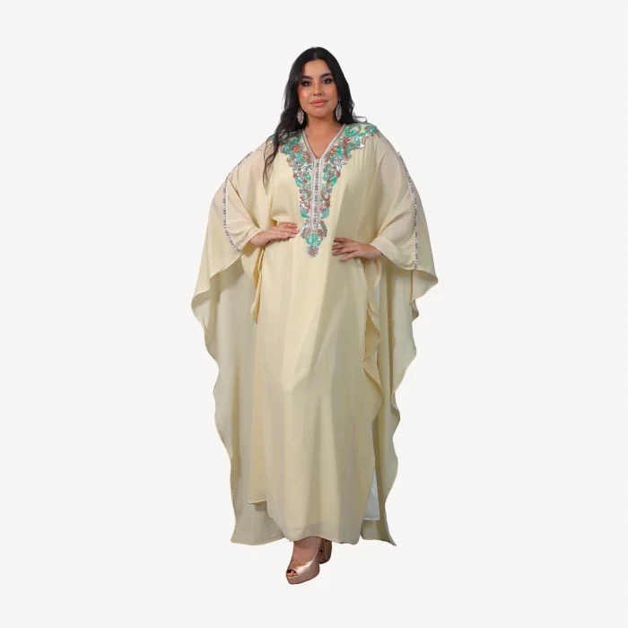 Découvrez la Gandoura Yasmin de Mautassin, une pièce unique qui incarne l’équilibre parfait entre tradition marocaine et modernité. Confectionnée avec soin à partir de crêpe georgette et de soie de haute qualité, cette gandoura se distingue par sa coupe fluide et gracieuse, sublimant chaque silhouette. Ornée de perlage artisanal et de broderies délicates, la Gandoura Yasmin offre une allure raffinée et élégante, idéale pour des occasions spéciales telles que des réceptions, des cérémonies ou des dîners élégants. Sa teinte blanc cassé ajoute une touche de pureté et de sophistication à cette pièce artisanale, la rendant incontournable pour celles qui recherchent un style chic et intemporel. Fabriquée à la main par des artisans qualifiés, la Gandoura Yasmin allie confort exceptionnel et esthétique soignée, célébrant l’excellence du savoir-faire marocain.