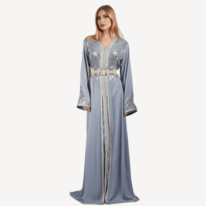Sublimez vos plus beaux moments avec la Takchita Aya Mautassin, une robe fluide en gris perle douce et apaisante. Ornée de broderies dorées travaillées à la main, elle conjugue simplicité et raffinement dans une parfaite harmonie.