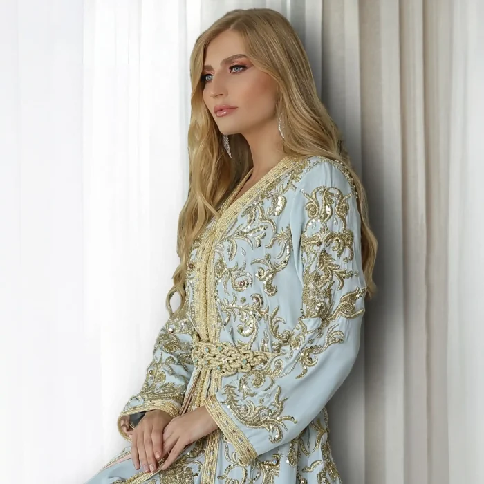 Takchita Rasha – Éclat Bleu Ciel et Élégance Artisanale pour Mariées Raffinées