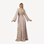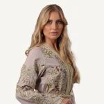 La Takchita Samar Mautassin, dans une teinte beige minéral apaisante, est une incarnation de l’élégance et du luxe discrets. Chaque détail de cette takchita est soigneusement conçu pour refléter un savoir-faire artisanal inégalé. Les broderies fines, réalisées à la main, se mêlent harmonieusement aux touches subtiles de perlage scintillant, conférant à cette pièce une aura de raffinement et de modernité.