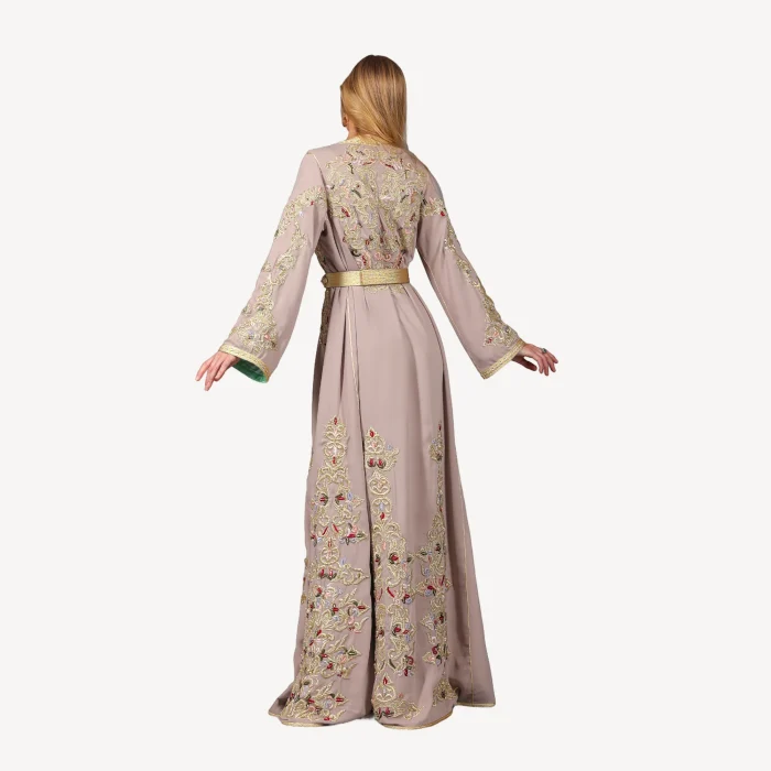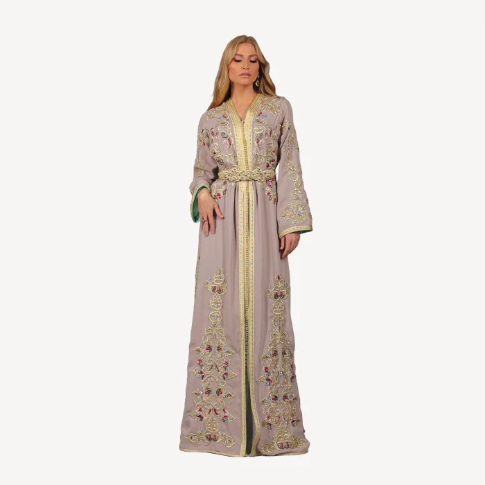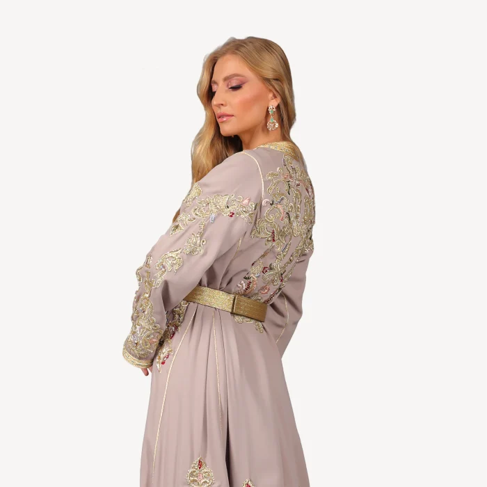 La Takchita Samar Mautassin, dans une teinte beige minéral apaisante, est une incarnation de l’élégance et du luxe discrets. Chaque détail de cette takchita est soigneusement conçu pour refléter un savoir-faire artisanal inégalé. Les broderies fines, réalisées à la main, se mêlent harmonieusement aux touches subtiles de perlage scintillant, conférant à cette pièce une aura de raffinement et de modernité.