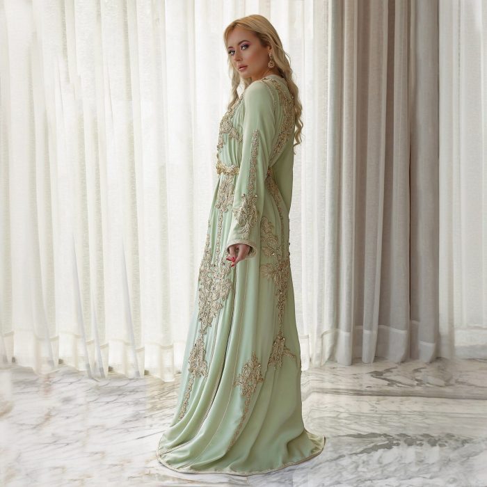 La Takchita mariée verte eau travaillée en doré de Mautassin. Un caftan marocain d’exception, parfait pour les mariages.